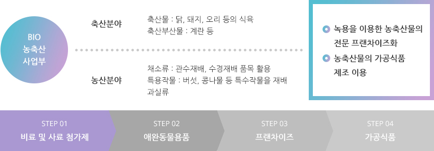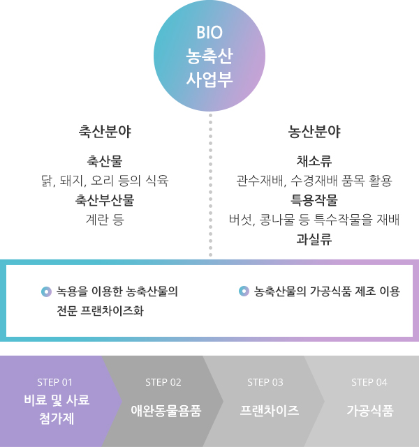 지속적인 R&D를 통해 Bio농업 전문기업으로 거듭나겠습니다.녹용유래세포 배양액은 농축산물과 결합시켜 무항생제 재배, 사육 및 고부가가치, 기능성 농축산물을 제조할 수 있는 원료로서, 현재 당사의 제품으로 출시되어 판매되고 있습니다.당사에서 육계, 산란계, 약용작물, 버섯, 채소 등에 접목하여 직영 농장과 집하 시설을 갖추어 유통되고 있습니다.농축산용 녹용배양액은 2500가지 이상의 동물성 단백질과 아미노산의 결정체로 각 물질과의 결합을 통해 이상적인 생육을 돕는 것으로 확인되었고 신기술 신품종의 개발에 성공하였습니다.농축산용 녹용배양액은 화학적인 항생제나 생장촉진제 없이 성장을 촉진시키고, 폐사율을 낮추며, 면역 조절, 보존기간의 연장 등에 기여하는 등 품질향상과 기능적 요소의 부가를 통해 고부가가치 제품을 개발할 수 있는 혁신적인 가능성을 평가 받고 있습니다. 셀로진은 각각의 성분, 기능에 따른 공인기관의 시험성적서를 보유하고 있으며, 현재는 농축산용 녹용배양액인 DACF-AF1이 동물성 의약품 관련 회사와 파트너쉽을 수립하고 동물성 의약품 개발의 공동 진행 예정에 있습니다.신동력 고부가 식품산업 “BIO 농업의 선두”에 서겠습니다.